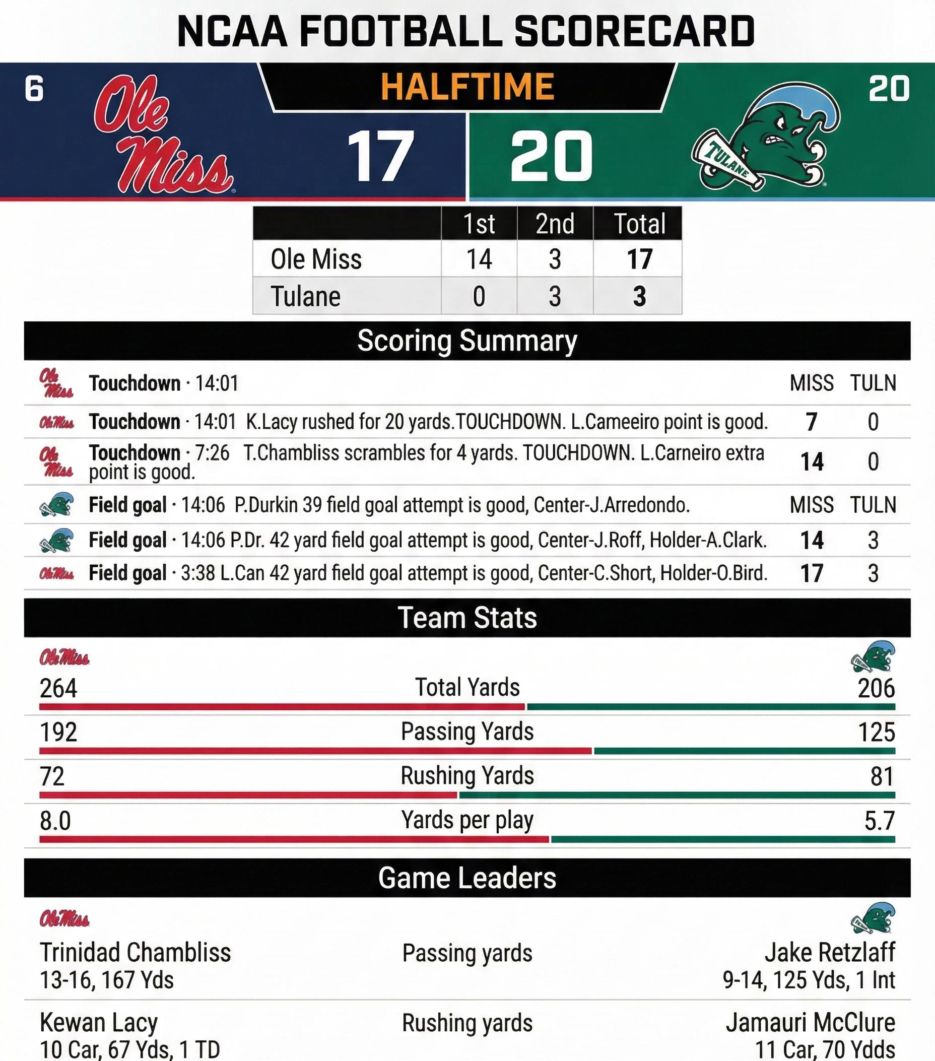 Ole Miss vs Tulane Halftime Report: Rebels Lead 17–3 in Playoff Showdown